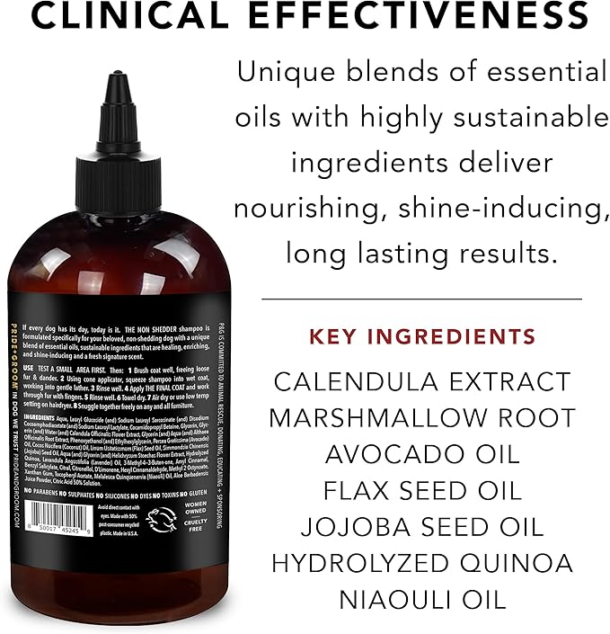 - THE NON SHEDDER SHAMPOO: Specifically created for your dog’s hair-coat THE NON SHEDDER skillfully heals, detangles and restores shine.