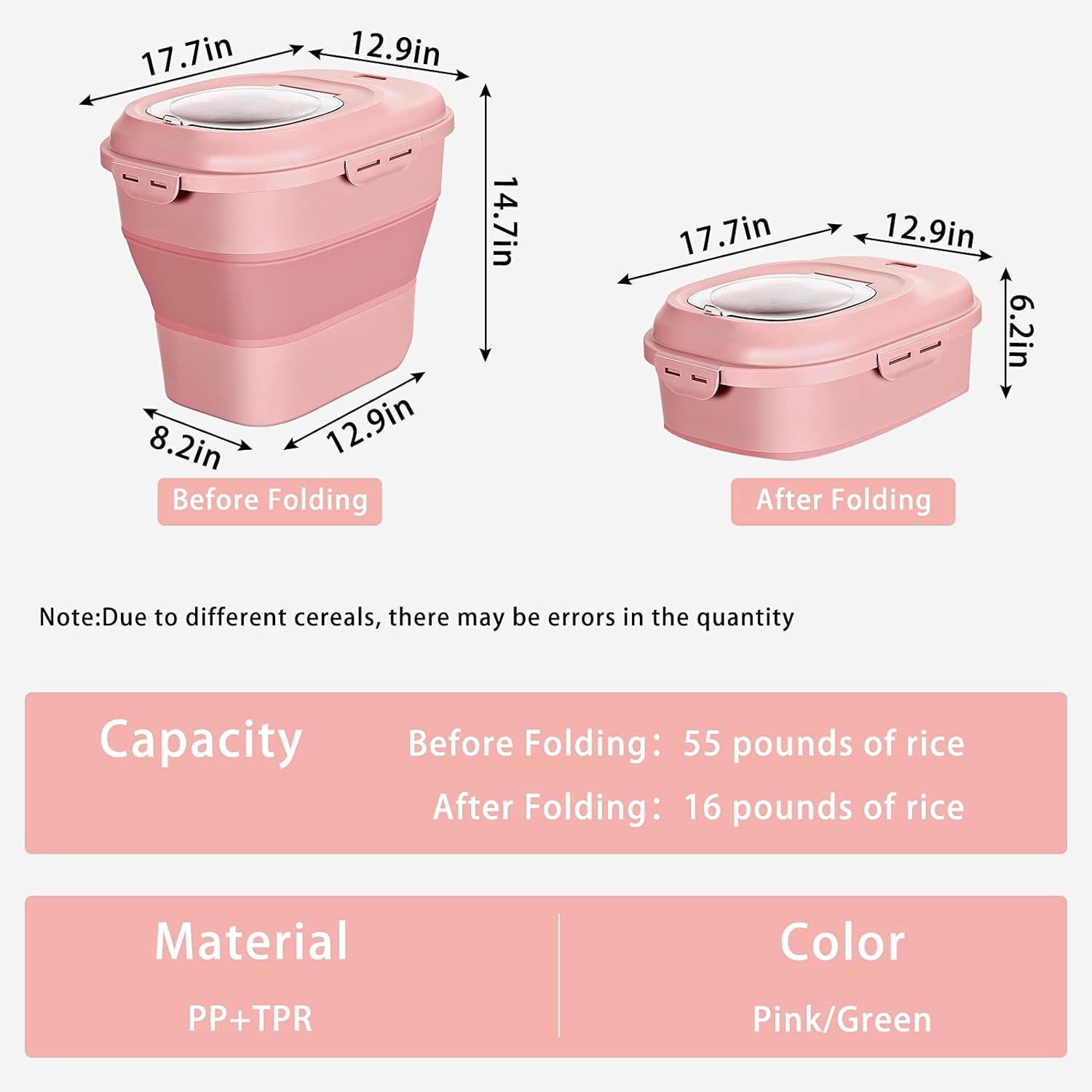 - đăExtra-large & Space SaverăExtra-large food storage container ideal for storing many things.Unfolded size:17.7"L x 12.9"W x 14.7"H, it has a capacity of 25L (23Qt) and can store about 50 lbs of rice or 30 pounds of pet food; Folded size:17.7"L x 12.9"W x 6.2"H , it has a capacity of 6.5L (6Qt) and can store about 20 lbs of rice or 13 pounds of pet food. When you need to put it away, you just need to press it down hard to fold it up to save your space.
