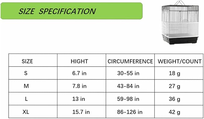 - SIZE. Circumference: About 30-55 in; Height: About 6.7 in. For meetting everyoneโs needs, we have newly launched an bird cage skirt extra large. In order to give you a better shopping experience, please check the size of your birdcage before you place an order.
