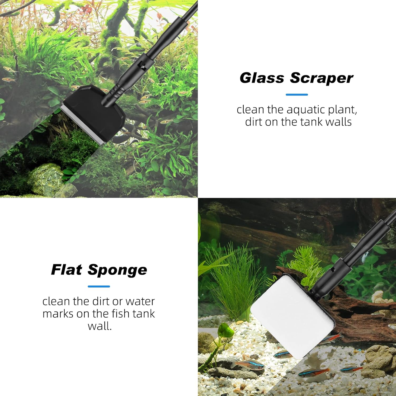 - Easy to install and use: The aquarium cleaning kit is easy to install and remove. Simply attach the handle and accessory holder to the rod,only takes a few seconds. Made of durable ABS plastic, non-slip handle, corrosion-resistant rod can be used for a long time, not easy to bend and rust