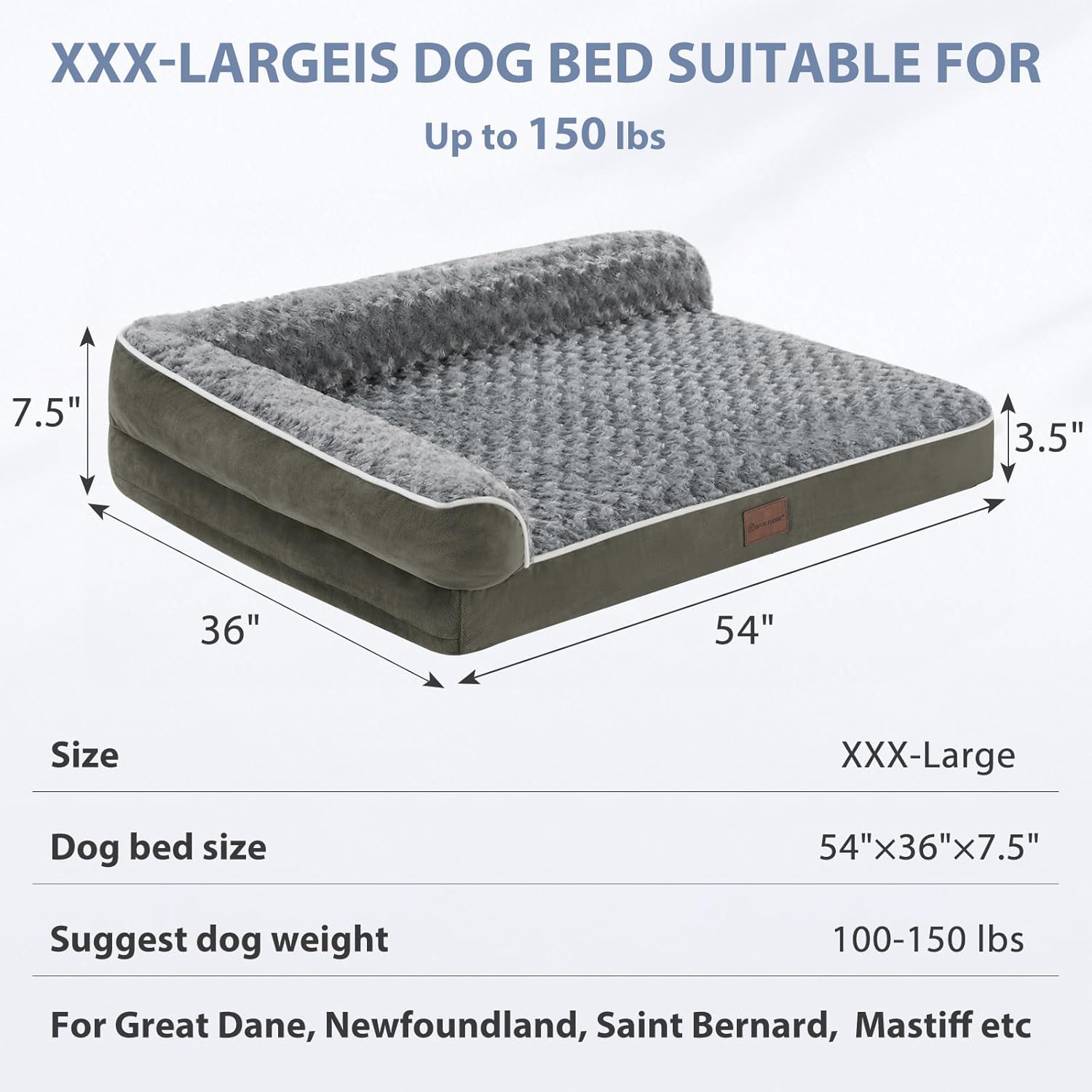 - SIZE(DOG BEDS FOR EXTRA DOGS): The dimensions of this XXL+ dog bed are 54“ x 36" x 7.5". XXL+ dog beds for extra large dogs up to 150 lbs. This orthopedic dog couch will give your pet more space and allow your friend to stretch out on the bed.