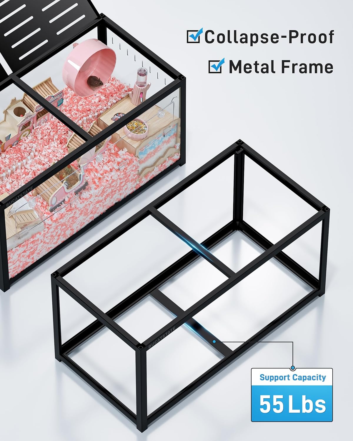 - 【5.4 ft² Large Hamster Cage】BUCATSTATE Hamster Cage 3.0 measuring a generous 39.3"L x 19.7"W x 20.4"H, the floor space approx 5.4 ft² and supporting up to 55lbs, this roomy syrian hamster cage offers a deep base for up to 9.4 inches of bedding. Perfect for degus, mice, and most syrian and dwarf hamsters, it provides ample space for tunneling and digging fun!