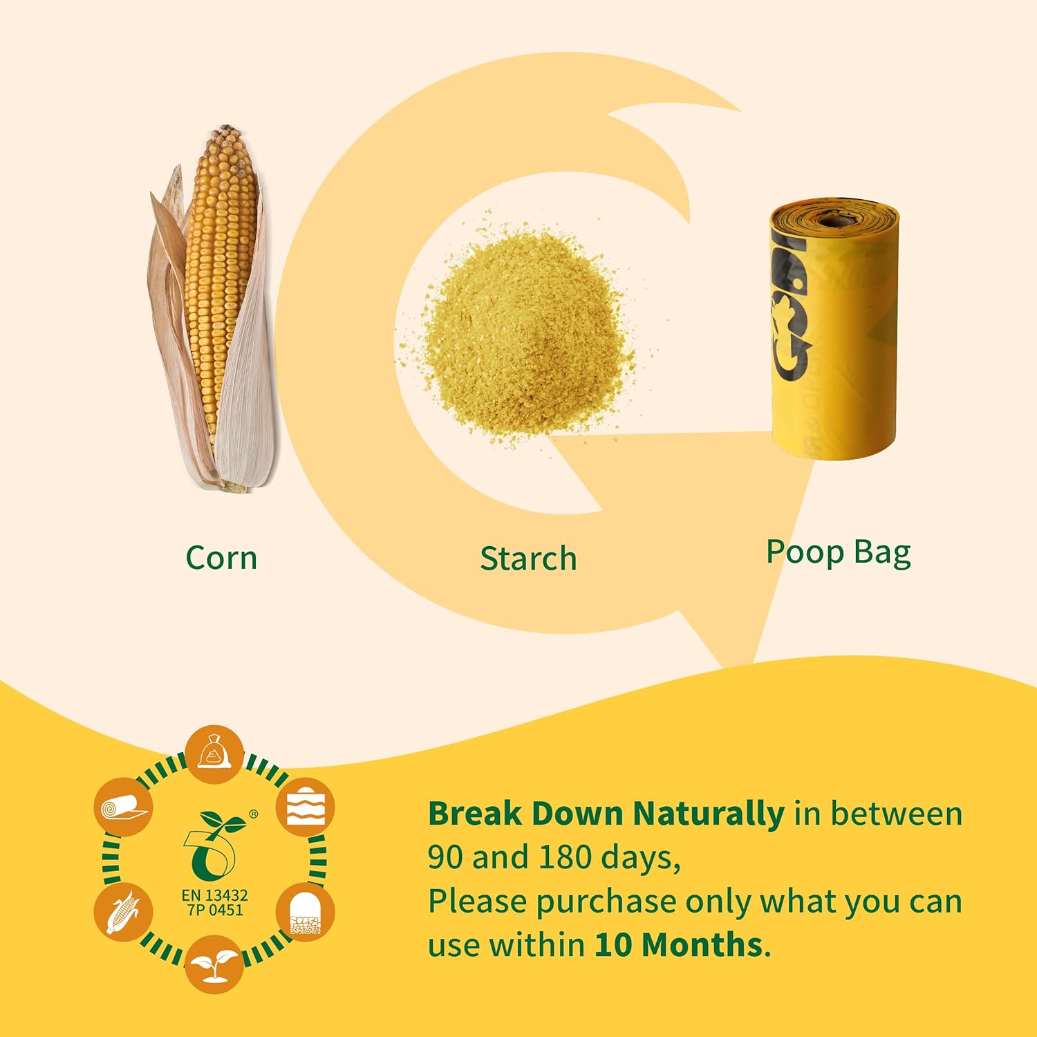 - š± ECO-friendly materials: Codirom dog poop bags are made of corn, vegetable oil, and PBAT (a fully compostable polymer). Keep the bags away from heat sources and store in a cool, dry place. The available time of compostable bags is nearly 12 months, so purchase only that will be used within 10 months.
