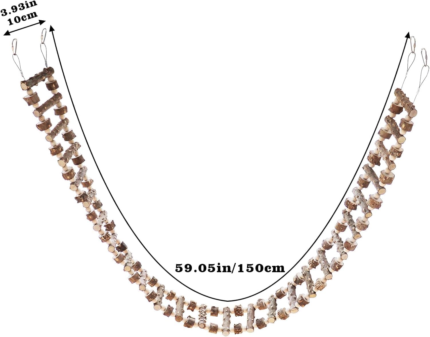 - Easy to Install: The total length of this bird ladder toy is about 59"/150 cm, and the total is about 0.45 pounds. There are two metal buckles at each end, which can be easily and safely installed anywhere. Our small animal bending bridge is not only suitable for all kinds of small animal cage accessories but also suitable for hanging in the garden woods for birds, squirrels, and other small animals to play and stand.