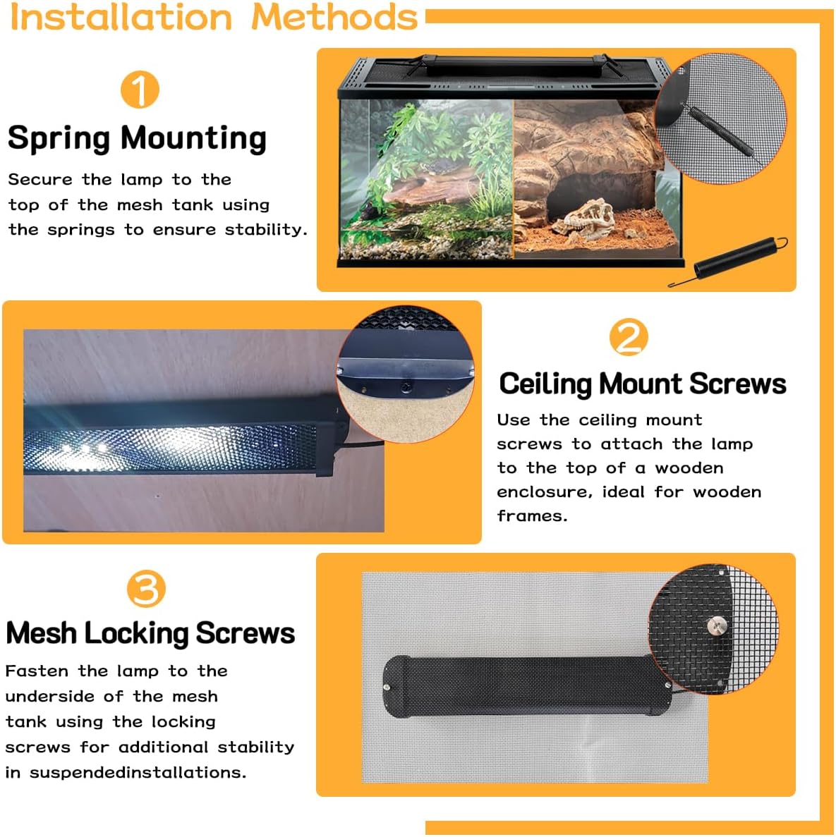 - Full Spectrum UVA and UVB Lighting - Experience the benefits of a balanced light spectrum with our UVB LED reptile light. Featuring both UVA and UVB LED beads, this fixture mimics natural sunlight, allowing your reptiles to bask as they would in the wild. The UVA rays promote natural behaviors and vibrant coloration, enhancing your pet's overall well-being