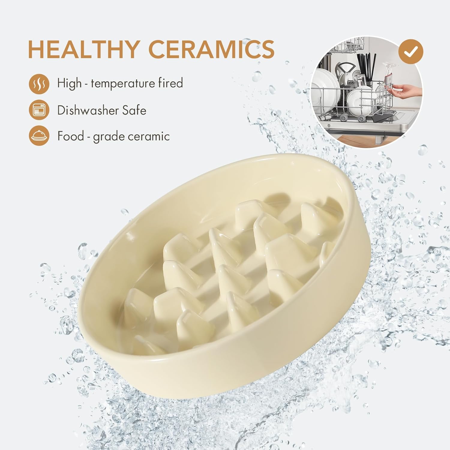 Ceramic 9.5 inch Dog Bowl Slow Feeder, Slow Pet Food Dish for Large Dog, Stop Bloat, Preventing Choking(Single Bowl, Beige)