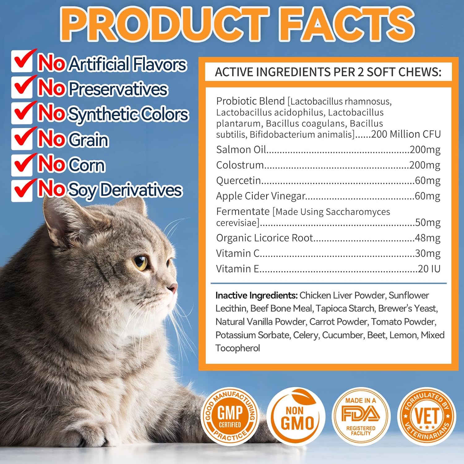 - Gentle & Safe for Sensitive Cats - Crafted with natural ingredients like Omega-3 oil, Quercetin, and Vitamin C, these chews are free from grains, soy, and corn. Perfect for cats with sensitive skin or allergies, offering a safe and gentle alternative.