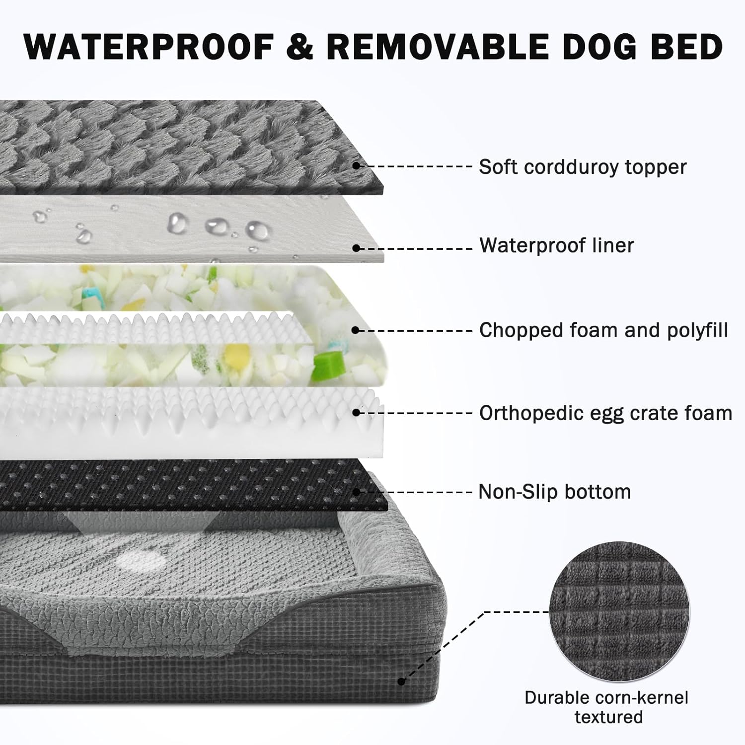 - 🐶WATERPROOF & WASHABLE DOG BED: The dog bed features a fully removable, machine-washable cover with a smooth double zipper for easy to quick remove and care, so just throw it in the washing machine and will be as good as new, ensuring your pet's space stays fresh and hygienic. The waterproof inner lining on the back of the dog bed cover fully protect the egg crate foam from spills, water damage, or accidents, prolonging the product's life.