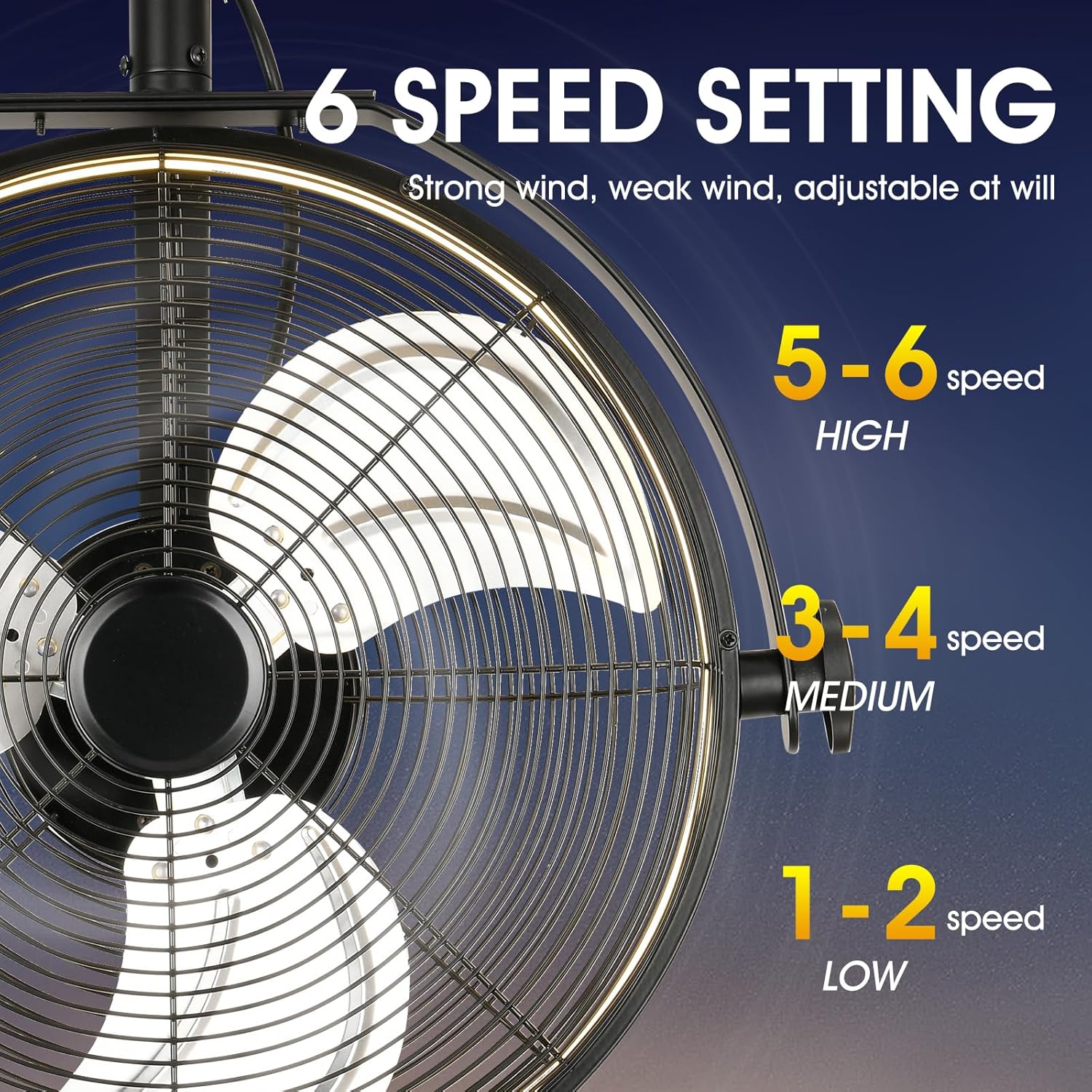 - ăHigh Velocity AirflowăThe wall mounted fan has 6 wind speeds for you to choose from,which can be controlled by remote for added convenience.garage ceiling fan runs at max 2900 CFM,providing powerful and quiet airflow for large spaces such as garages,stores,covered patios,to meet your multifaceted needs!
