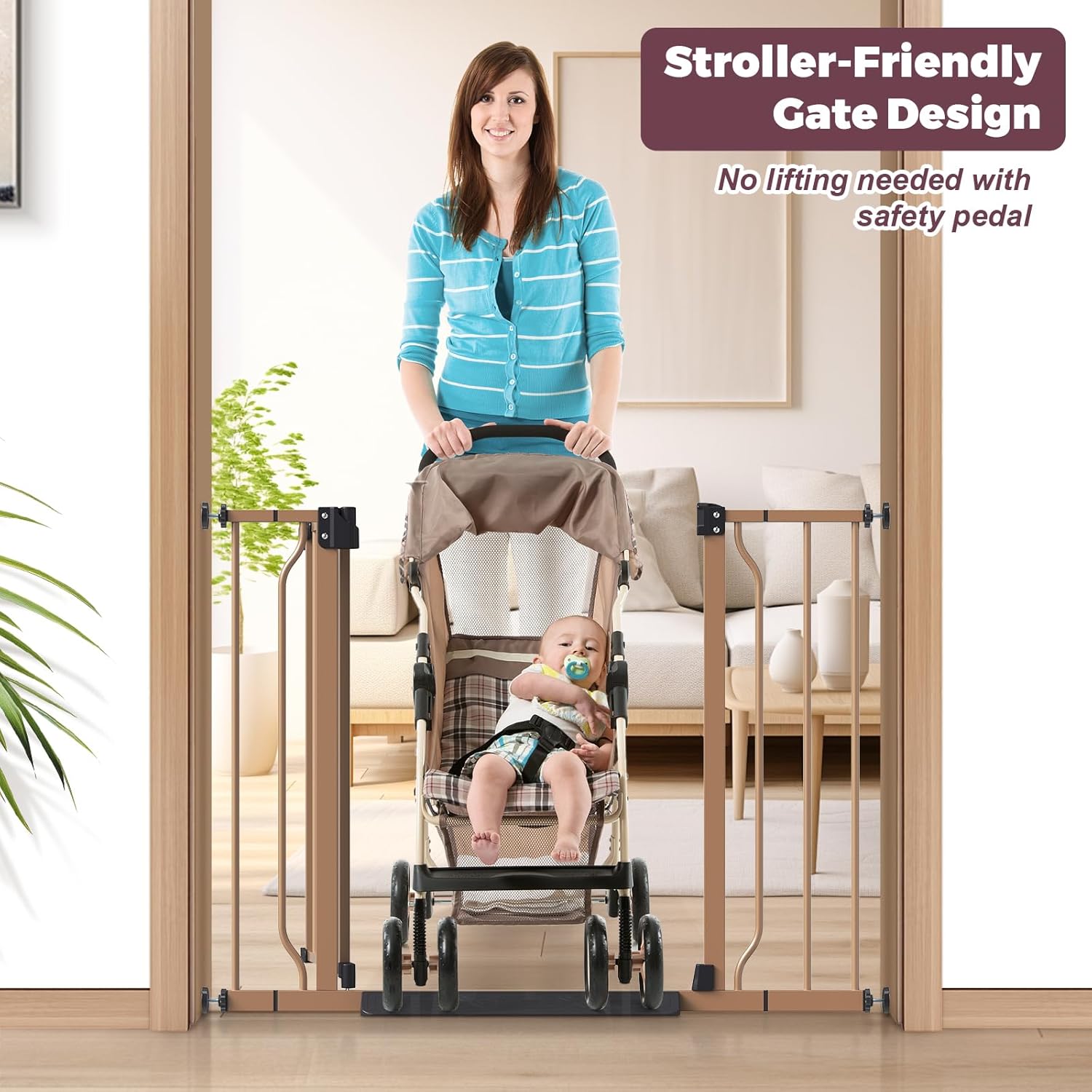 - Stroller-Friendly Baby Gate: Features an anti-stumble pedal, ensuring a seamless transition between the baby gate for stairs and the floor. This design reduces the risk of tripping and allows strollers to roll through effortlessly, making it ideal for families with elderly members and young children.