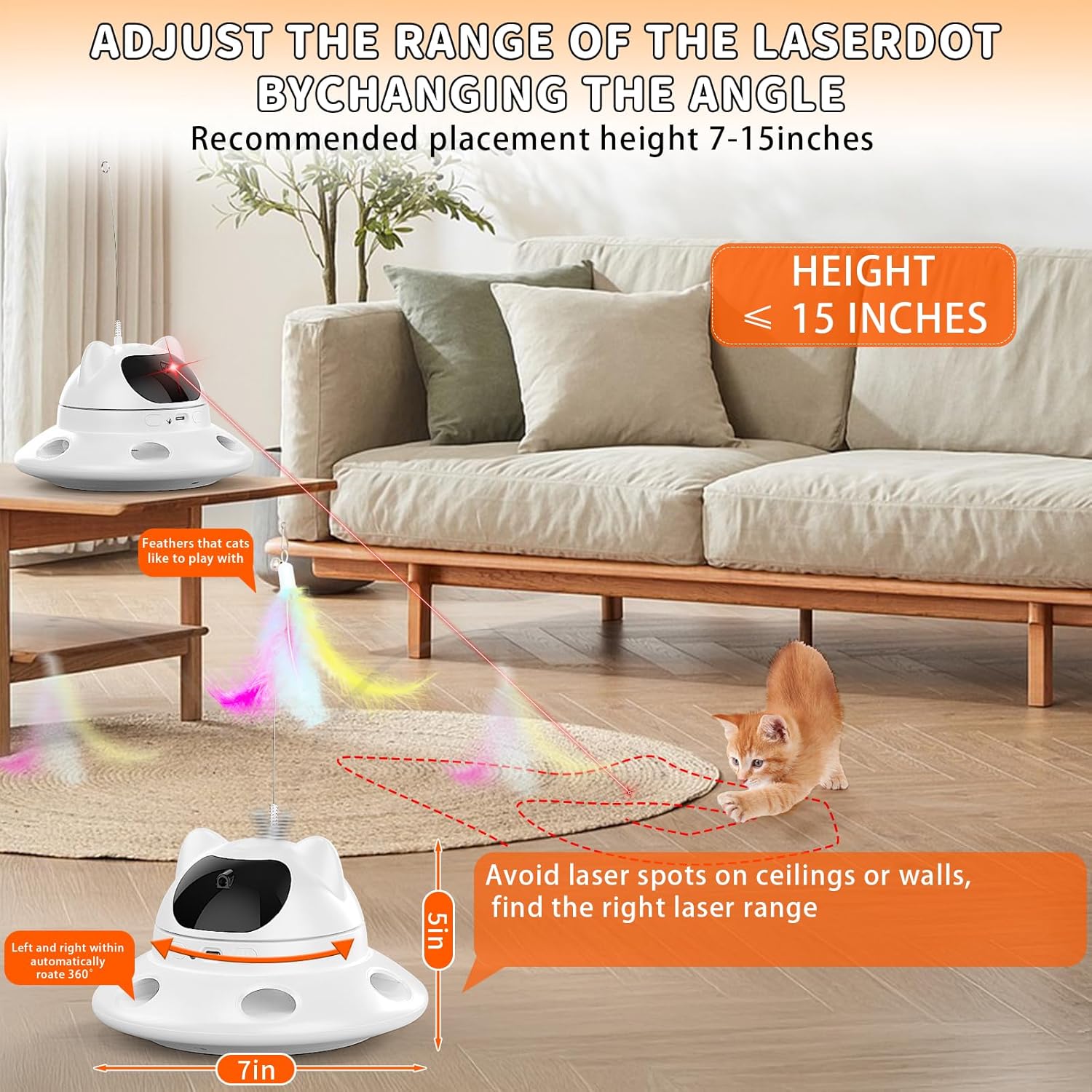 - šÆ 3-in-1 Cat Laser Toys Unique dots, stars, butterflies, mice, smiling faces, laser patterns, automatic 360 ° random laser trajectory, unpredictable red laser motion stimulates cats to chase and play. The head teasing cat stick bell feathers attract cats to slap, and feathers are randomly shot out from 6 holes to encourage your cat to pounce and slap. Perfectly matched with various scenarios, there is no need to worry about indoor cats hitting anything that may fall or break.
