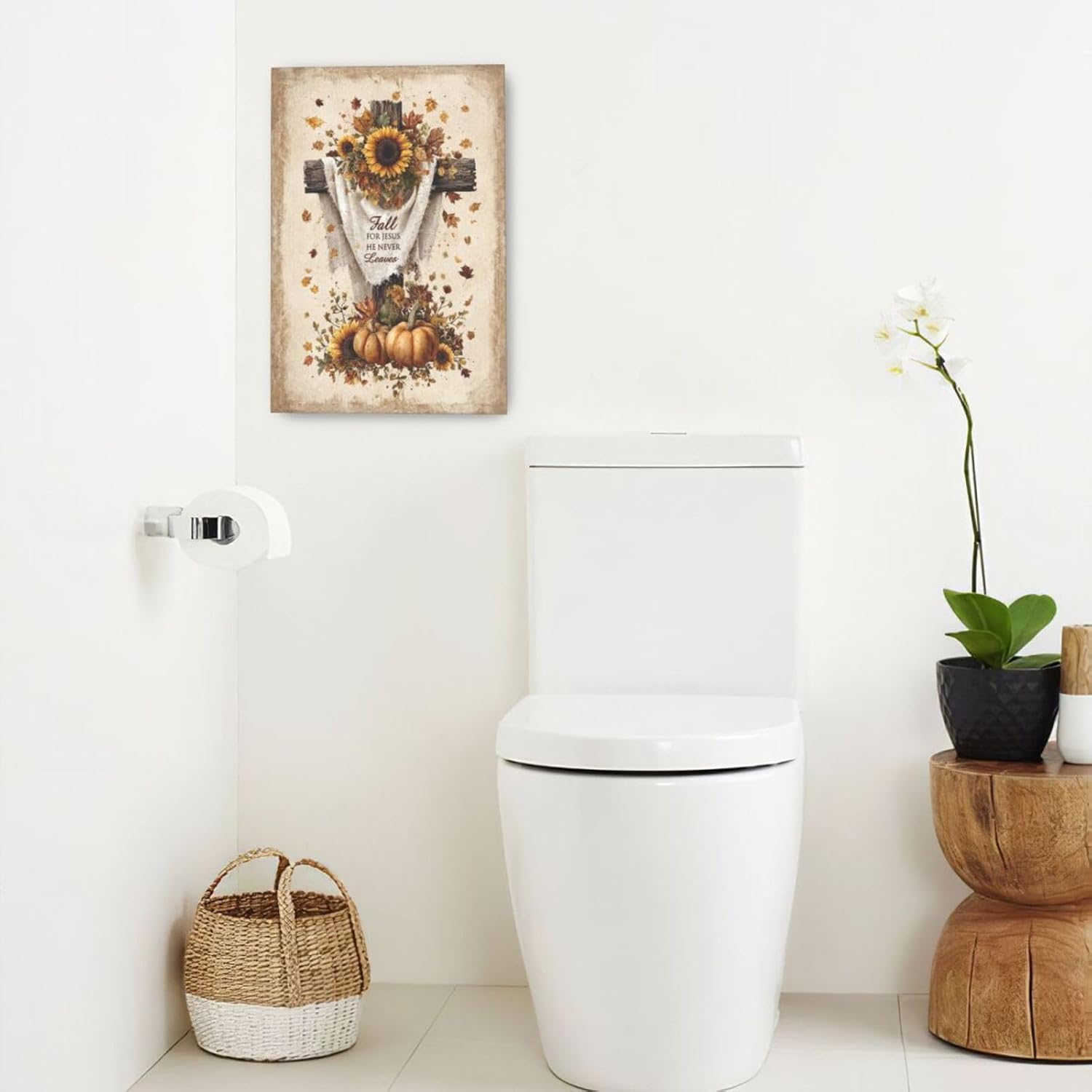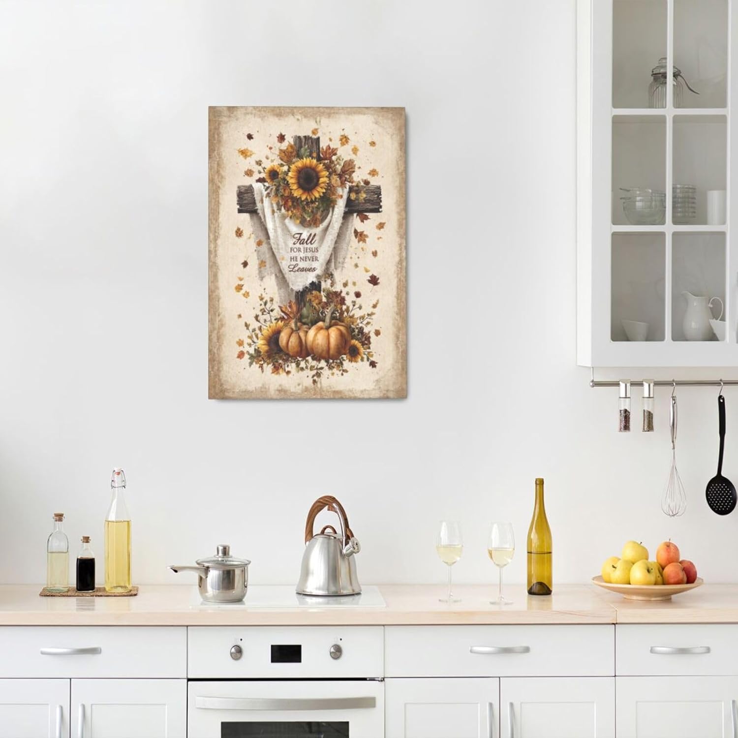 Christian Fall Wall Art Autumn Rustic Cross Sunflower Pumpkin Wall Decor Fall for Jesus He Never Leaves Pictures Painting Print Framed Artwork Decorations Gifts for Living Room Bedroom Prayer Room Office 16"x24"