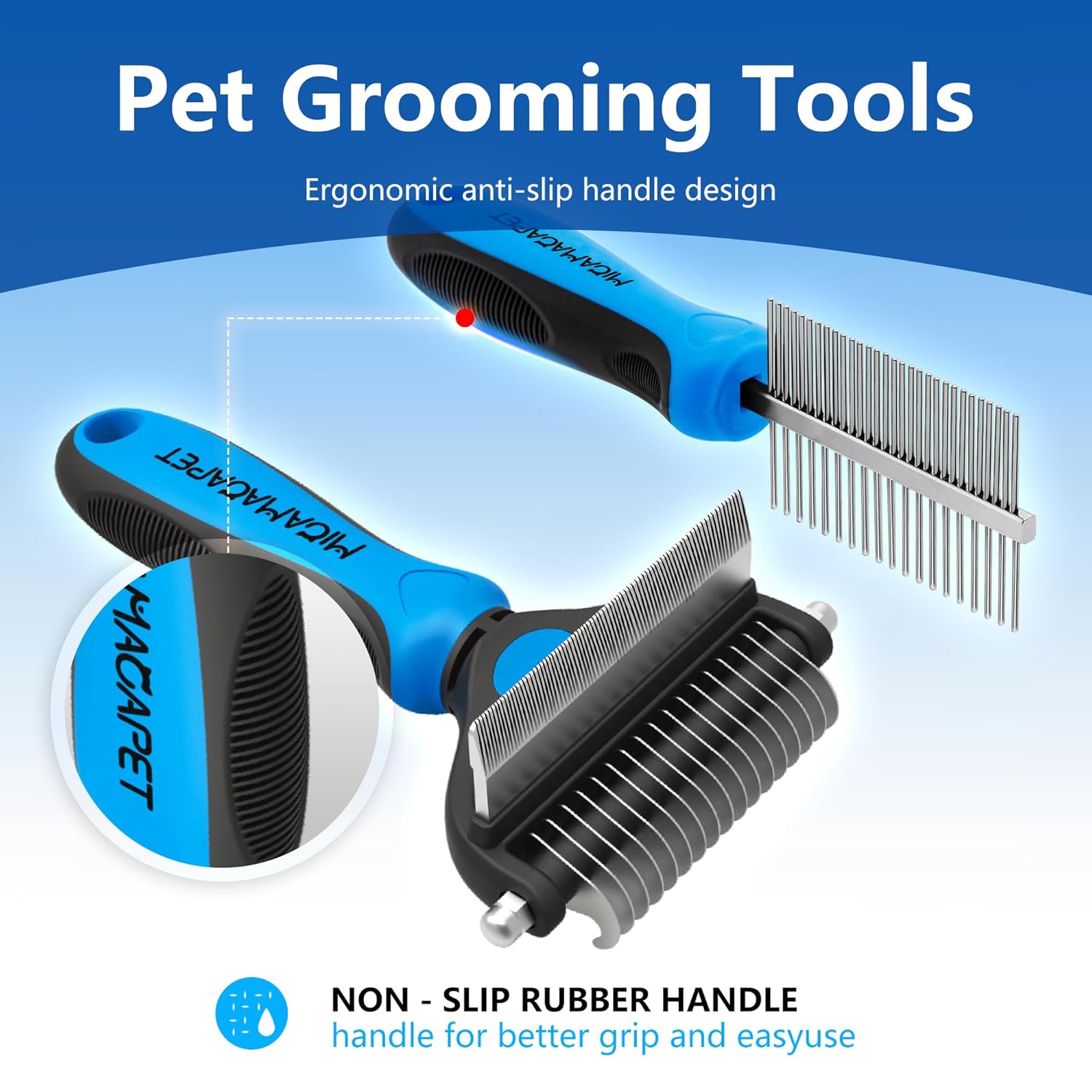 - 【Ergonomic design】: with stainless steel needle teeth, sturdy and durable, the rubberized grip that conforms to the curve of the hand has a non-slip pattern, conforming to the ergonomic grip standard, it is a pet de-shedding and grooming tool for small cats and dogs and medium and large dogs.
